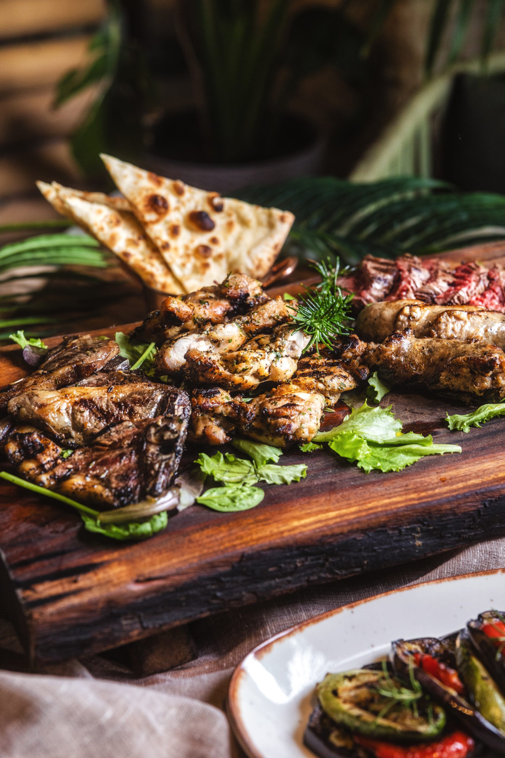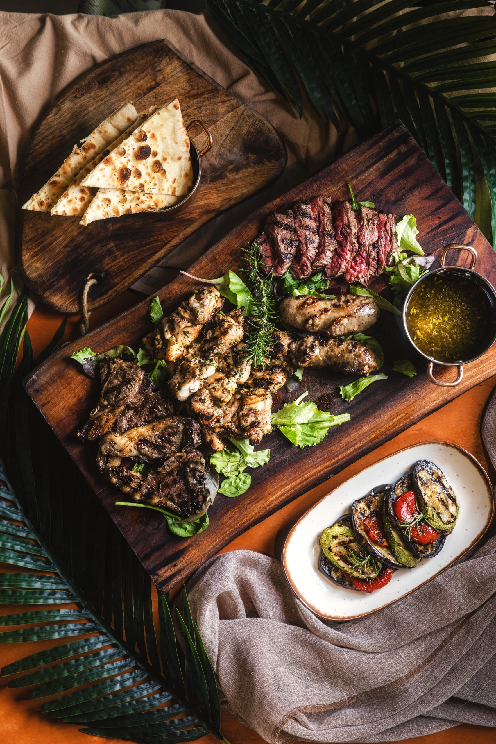 Enjoy tender chicken thighs, pork sausages, beef flank, lamb chops, fresh bread and grilled veggies.